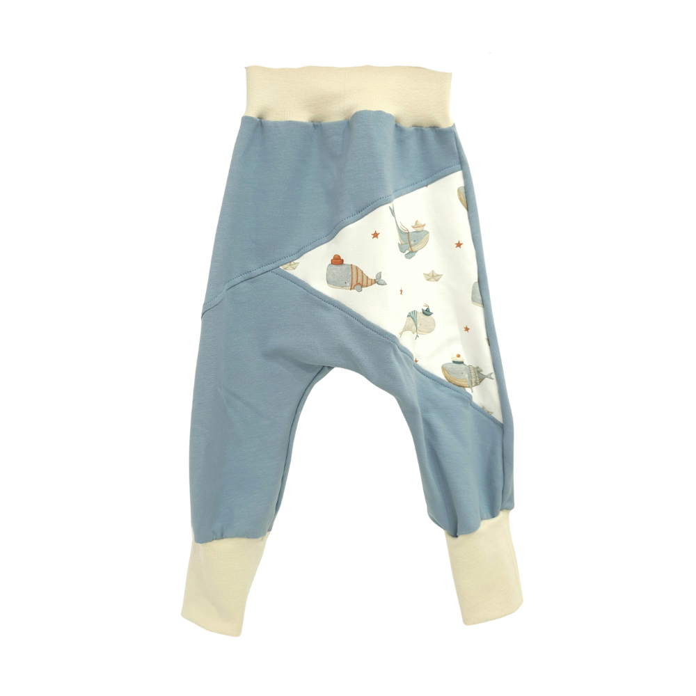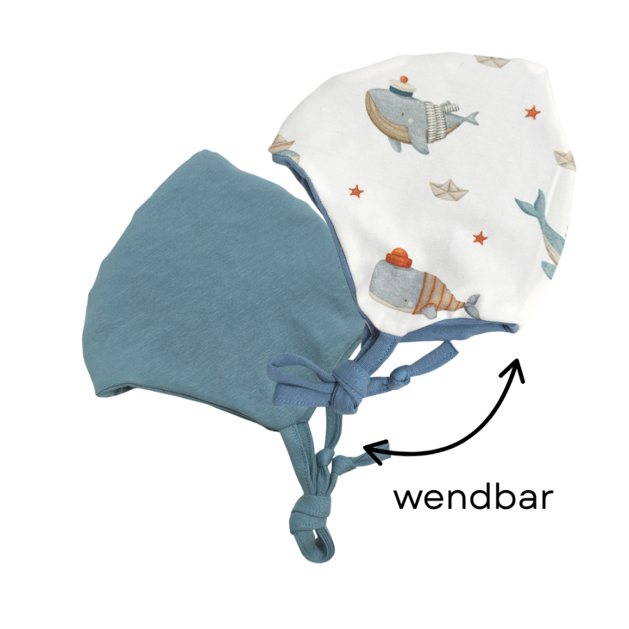 Unser liebevoll zusammengestelltes Set aus der Küstenkind-Kollektion Wale Schiffchen vereint maritimen Charme mit durchdachtem Design. Es besteht aus einem gemütlichen Wendejäckchen, Pumphose, einer Mütze nach Wahl – entweder als Bindemütze oder Knotenmütze – sowie einem passenden Halstuch.