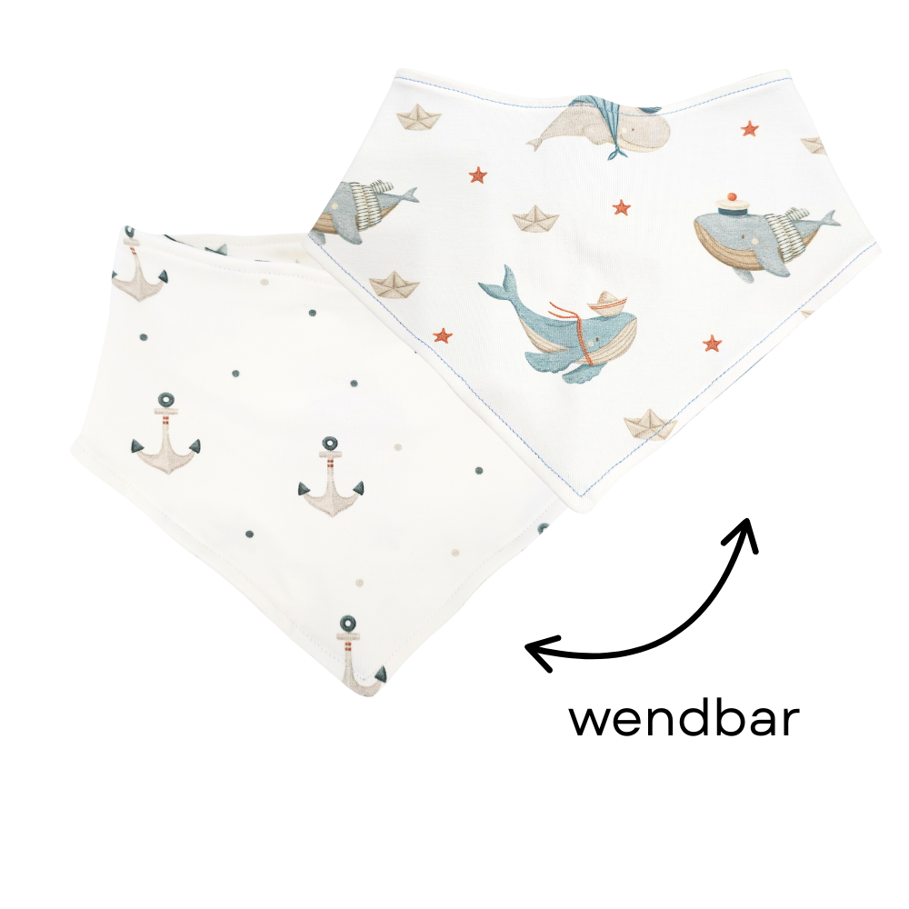 Sowohl die Bindemütze als auch das Halstuch sind wendbar und bieten damit gleich zwei schöne Looks in einem. Perfekt abgestimmt in sanften Küstenfarben und aus weichen, hautfreundlichen Materialien gefertigt – ideal für kleine Entdecker*innen von Anfang an.