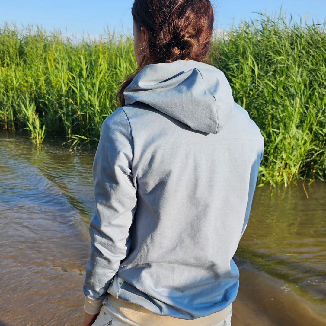 Der Hoodie ist ein langärmeliges Oberteil mit einer Kapuze, das meist aus weichem Sweatstoff, Baumwolle besteht. Charakteristisch sind die Kapuze mit Kordelzug, eine große Bauchtasche oder seitliche Taschen sowie Bündchen an Ärmeln und Saum. Hoodies gibt es in verschiedenen Passformen, von locker bis figurbetont, und in zahlreichen Designs - von schlichten Basic - Modellen bis hin zu Varianten mit Prints, Logos oder Reißverschlüssen. Sie sind besonders beliebt für Freizeit, Sport und Streetwear, da sie warm, bequem und vielseitig kombinierbar sind. Empfehlung der Gründerin: