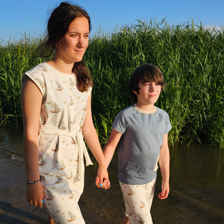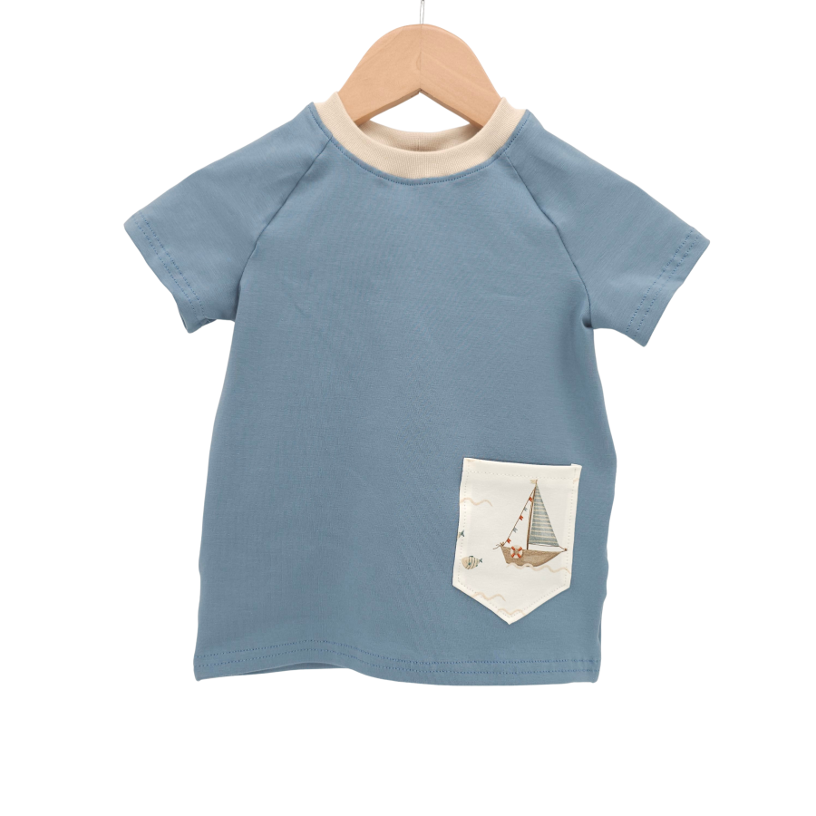 T-Shirt Basic taubenblau mit Tasche Küstenkind Boote Fische